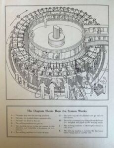First, the cows were herded one by one onto the circular moving platform. They were then rotated to the second station where they were washed with sprinklers and hoses and dried with hot air. The milking machines were put on next and they are milked for the 12 ½ minutes while completing their rotation. The machines are then removed and the cows step off of the platform to go back to their barns. The milk is funneled away to the bottling room and the milking machines are rinsed in cold water and then sterilized in hot water before being placed on the next cow. In the diagram image you can see the observation deck in the center where visitors could watch the procession.