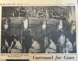 The Rotolactor was not only efficient time-wise, reducing the number of man-hours spent milking, but also revolutionary in hygiene. The machinery used for milking was sterilized after each milking and the milk was able to move from cow to bottle through a closed system, coming in to contact with only sterilized surfaces and no outside air. It is said that H. W. Jeffers was inspired by reading about Henry Ford’s assembly belt for the Model T on his trip home from Europe to study agriculture and milk production. The idea was to keep the workers stationary and bring the work (i.e. the cows) to them. The Rotolactor was so impressive that it was one of the most popular exhibits at the New York World’s Fair in 1939. Thousands of visitors also flocked to Plainsboro to see the Rotolactor in action at Walker-Gordon Farms and it was a hot spot for many school trips, as you can see in the newspaper photo below from 1963.